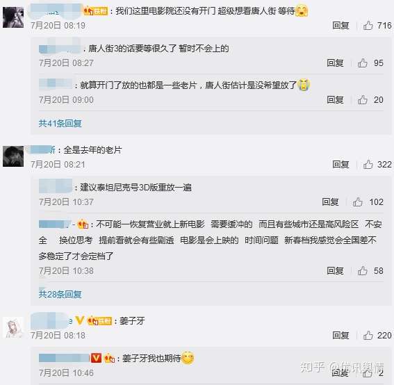 从网友评论看,对于影院复工,不少网友已经欣喜刷过一波了,而部分地区影院并未开放,网友表示遗憾,另外,也有不少网友更期待《美人鱼2》《唐人街探案3》《姜子牙》《坚如磐石》《鬼吹灯之天星术》《刺杀小说家》等新片。